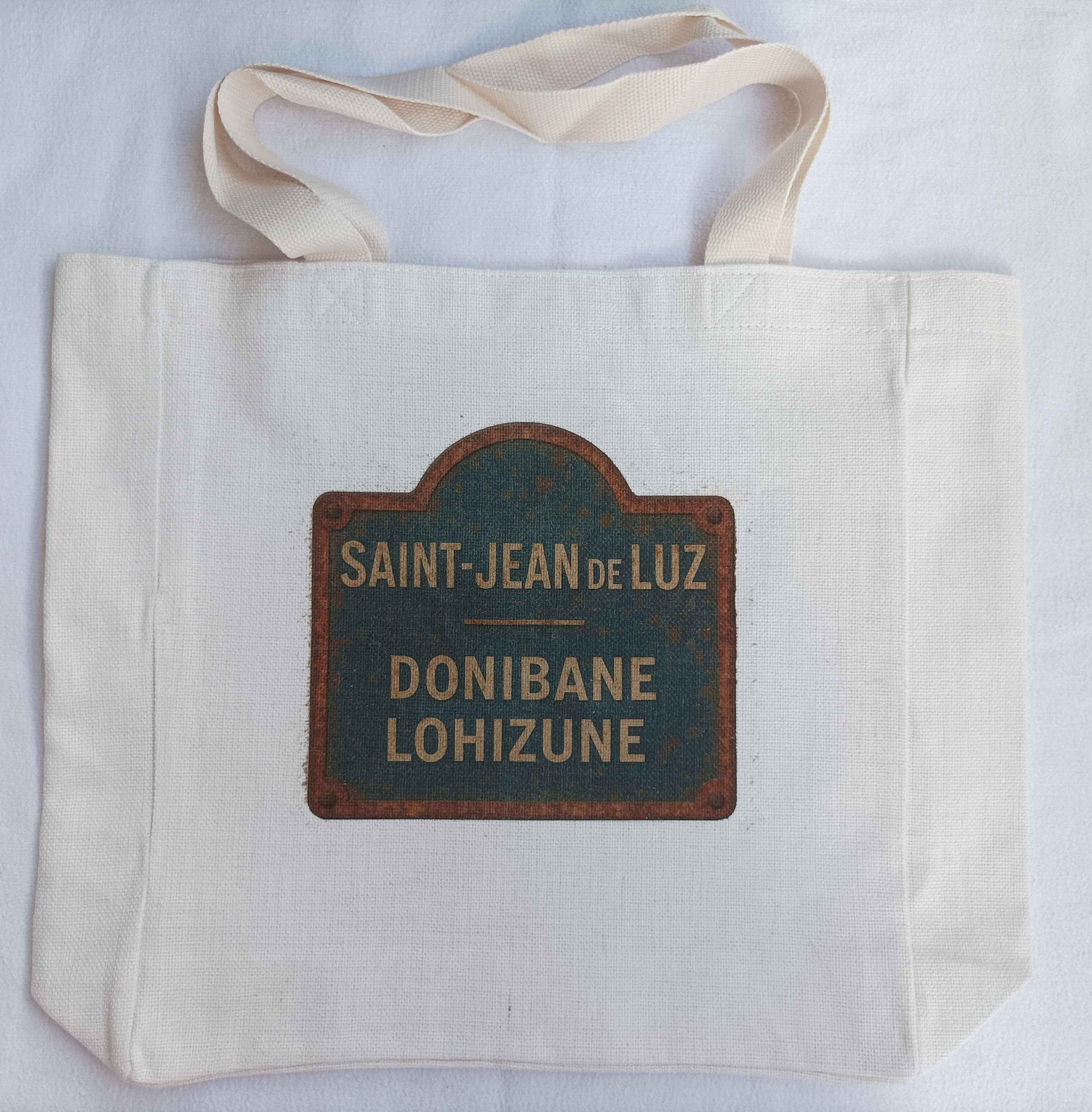 Un tote bag au charme vintage qui rend hommage aux plaques de rue emblématiques de Saint-Jean-de-Luz, avec son nom en français et en basque : Donibane Lohizune.